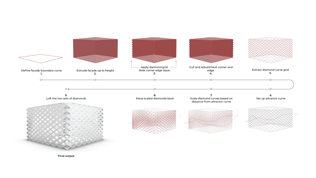 The main variable parameter in the facade is the size of the apertures, and the code developed to define such facade revolves around setting up a base diamond grid on which the rhomboid openings are controlled via an attractor curve.