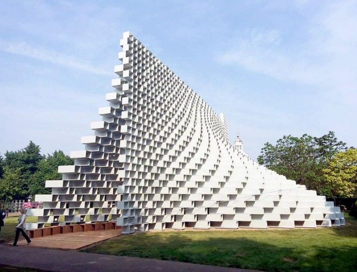 “For the Serpentine Pavilion 2016, they have attempted to design a structure that embodies multiple aspects that are often perceived as opposites: a structure that is freeform yet rigorous, modular yet sculptural, both transparent and opaque, both box and blob. We decided to work with one of the most basic elements of architecture: the brick wall. Rather than clay bricks or stone blocks – the wall is erected from extruded fiberglass frames stacked on top of each other. The wall is pulled apart to form a cavity within it, to house the events of the Pavilion’s programme.”