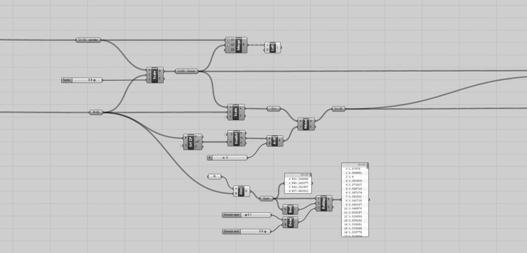 Next step is to generate the lateral faces of the hexagonal skeleton by scaling and translating the scaled curves according to the surface normals (see fig 04 – 05). An attractor point was setted from a point drawed in Rhino, to remap the distance values as scale factors from the Scale component. By changing the Domain values (Start and End) the minimum and maximum frame width is controlled respectively (see fig 06 – 07).