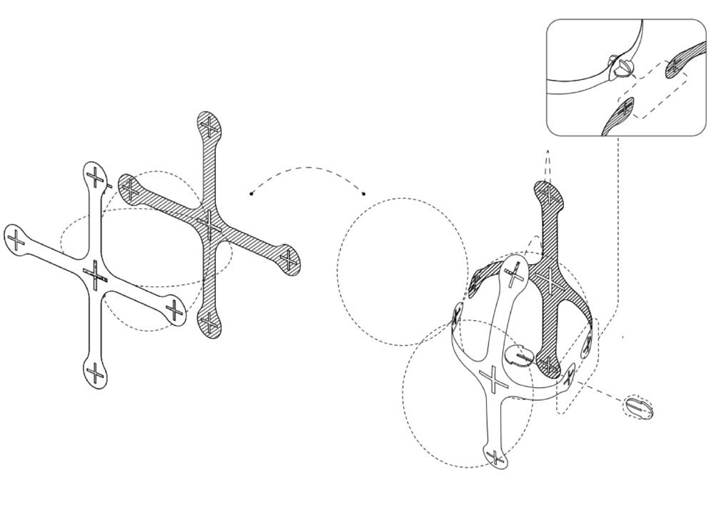 Minimizing the amounts of cuts while testing the bending properties of different materials. Original intenstions to create the structure in 0.4 mm plywood. Each Star Ball have 6 connection point, the design intesion was to differenciate the joint from the star structure, through it’s material and thickness? Exploring the different incuts possible to make the structure more maleable and bendable. For this prototype as the chosen material was card simple engravings suffised to achieve a bendable surface.