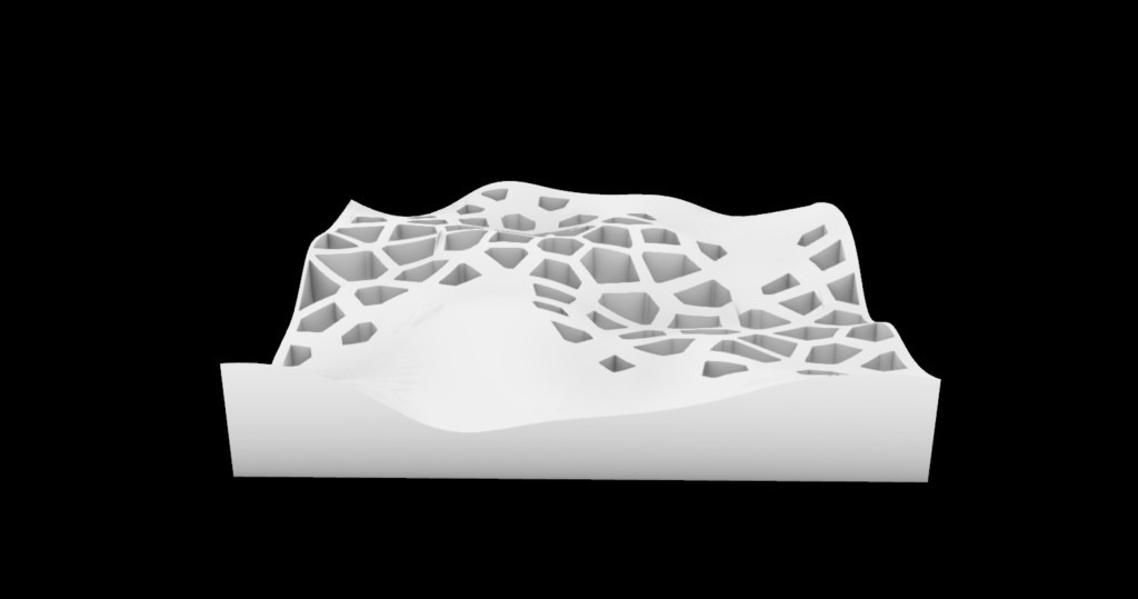 The initial idea was to use the basic geometry of the HONEYCOMB and morph it into an undulated surface. The perforations are continuously altering in size and location while it travels along the undulated surface creating pockets of spaces. This volume could eventually be a space within itself and aggregate into a pattern of a nested space.