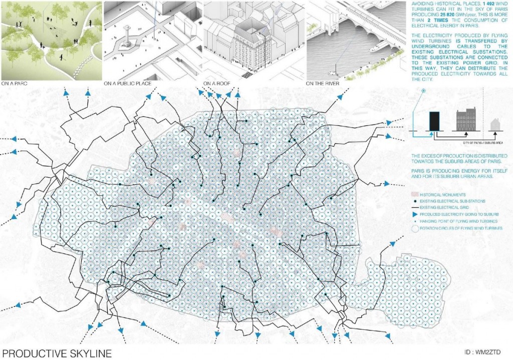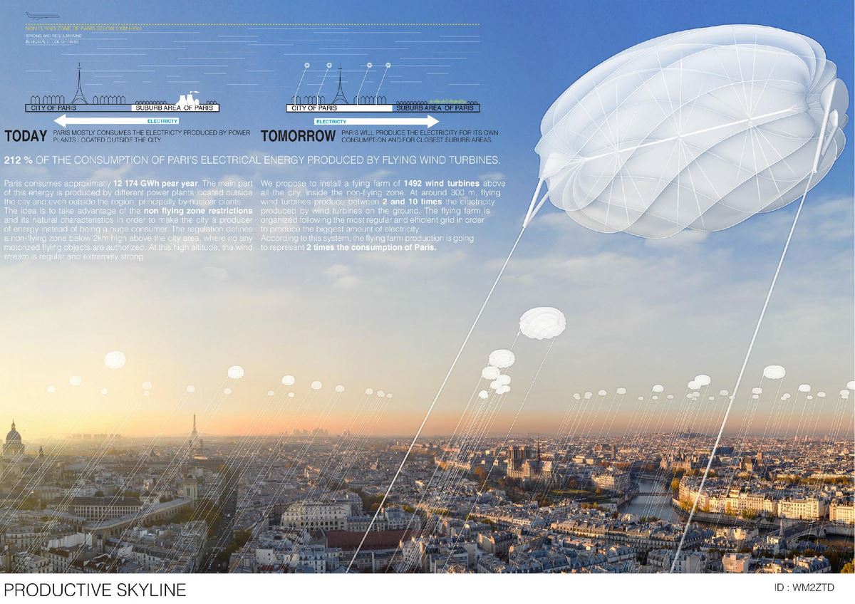 Productive Skyline designed by Sylvain Totaro and Aurelien Bru, third prize at the competition, is a flying farm of 1492 wind turbines installed above the city of Paris which will produced two times the energy consumed by the city.