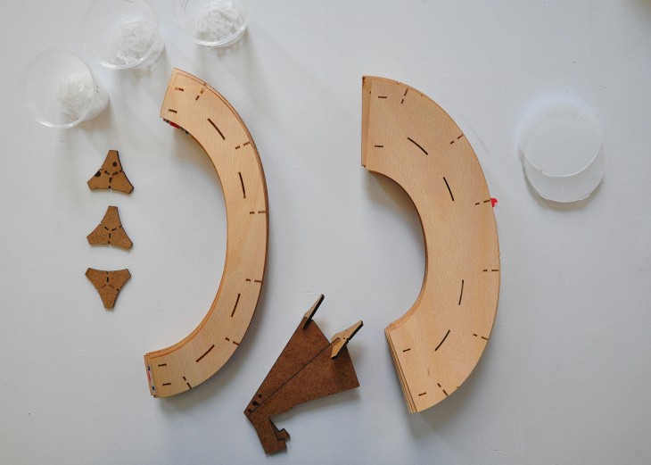 To obtain the cone; the wood was laser cut a 70% of speed and 250% of power, each cone included gaps strategically placed among the surface to serve as place holders for the joints. The joints were cut the same way however in order for us to obtain great results, the power and speed were altered. For 1 mm polypropylene (joints used to close the cone) the speed was at 70% with 25% power. To cut 2.5 mm plywood  (joints used to connect between cones) the speed was at 50% with 360% power.