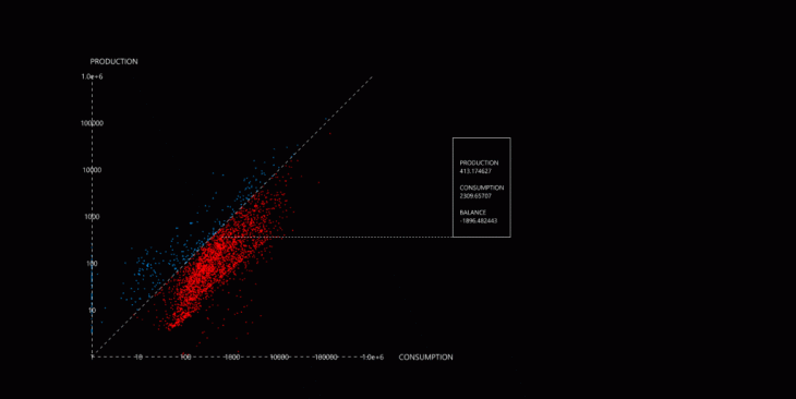 Finally, we used this mix of map and diagram to show the balance between consumption and production to see if there were some buildings that are net producers and identify the potential of energy exchange (Figure 10). This exercise showed us that there wasn’t a clear pattern of energy flows, and we thought the output showed a chaotic flow that characterized each building. In the end, we thought that this type of visualizations can have potential, with the use of adequate filters, and aesthetic editing it could show interesting underlying patterns. We decided to use another kind of representation, based on the existing energy grid.