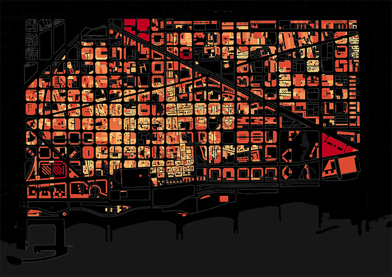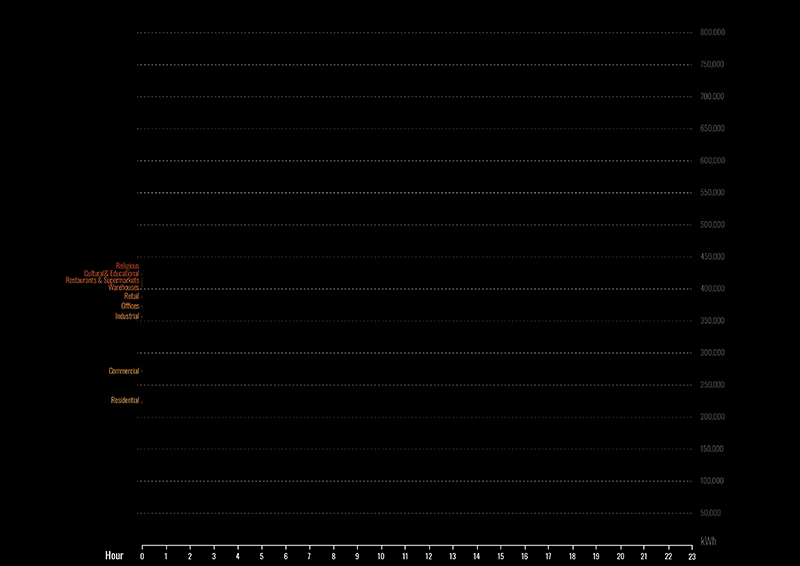 The Sankey diagram has been used to better represent a flow of energy. It shows from left the time of the day, in the middle column the proportion of land uses on Poblenou and on the right one the percentage of that consumption that is supplied by non-renewable resources and renewables. This Graph helped us to link the different layers of information that we already had, understanding how they relate to each other. It is visible how the consumption is higher at night, how residential, industrial and offices are the main consumers and what percentage of that energy can be obtained from renewable sources (Figure 8).