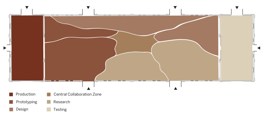 Mycelium Walls: Vertical separations were created from the program and circulation, considering the location of existing windows, type of work and requirements for each space. Each separation follows a mycelium branching pattern overhead.