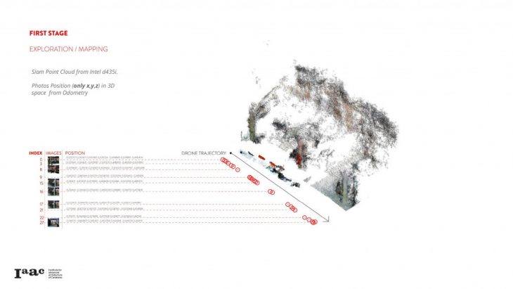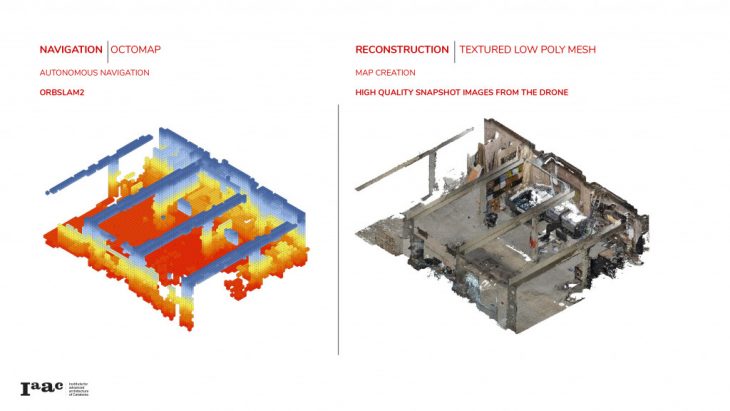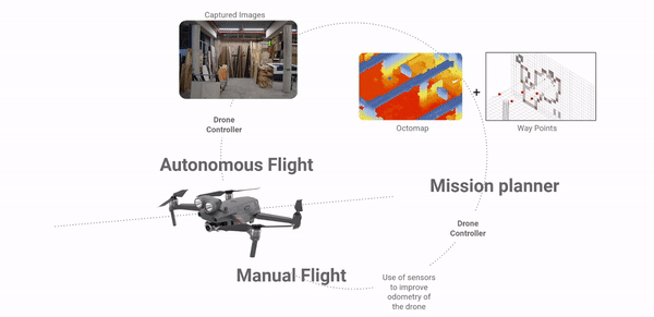 From the exploration flight we have two desired outputs, the first one being an octomap from OrbSlam2 for a further autonomous flight and the second one a colored dense point cloud from photogrammetry. The point cloud will be used to produce a 3D environment where all data acquired will be shown. e shown.