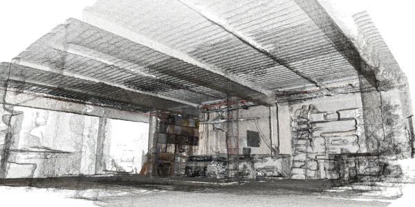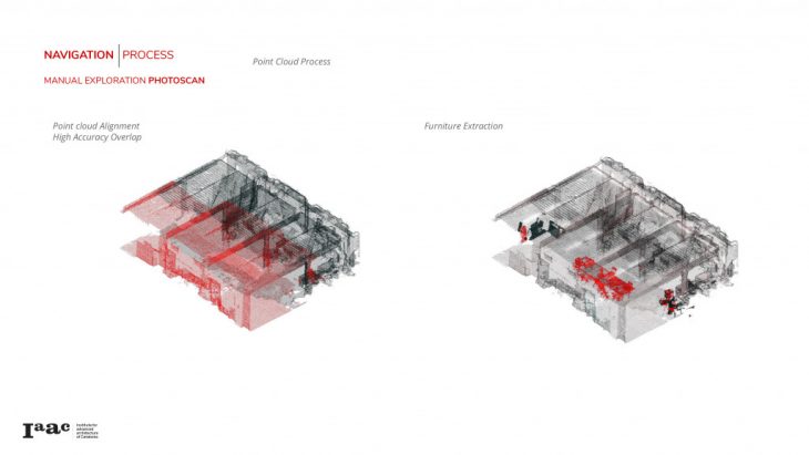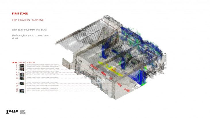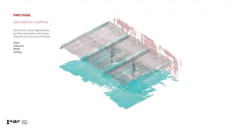 The next images show our experiments using the high quality images from the drone to reconstruct the 3D environment. Two different sets of point clouds were necessary to create the complete point cloud. The environment was then processed in Cloud Compare to extract the architectural and structural elements from the point cloud. After having all the elements as geometry files, the surfaces or meshes were imported into Grasshopper for further cleaning. The output of the whole process were clean quad mesh elements named as: ceiling, beams, columns, floor and wall.