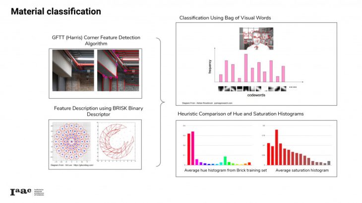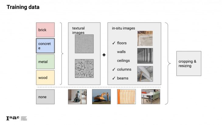 Our classifier system is trained with one set of images for each category, both close up to describe the texture of the material, and as part of various building elements to describe its shape. Finally we have included a None category which contains imagery of other people and objects that will commonly be found in a demolition site, in order to avoid false positives.