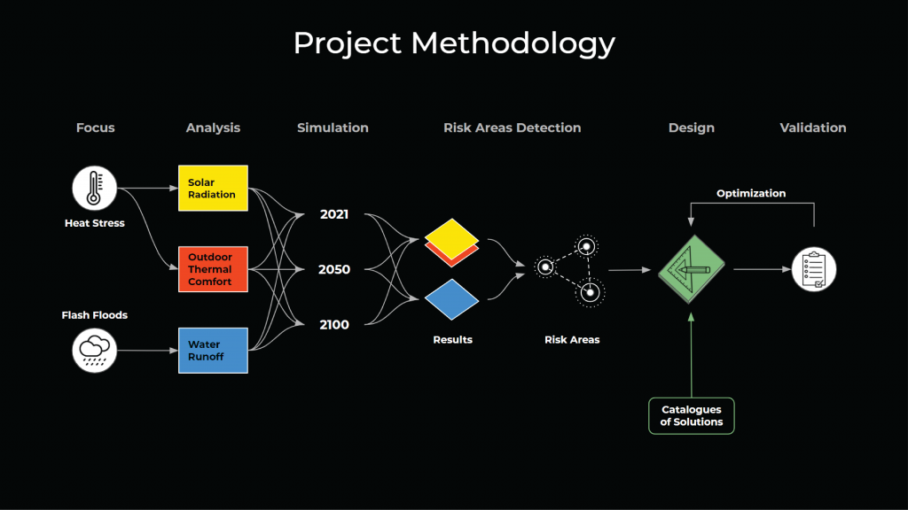 Once we select the two main challenges we analyzed the future scenarios by creating simulations for 2050 and 2100 which are the years of expectancy growth of temperature and the increasing water runoff, whit that we create a map of the risk areas of the district in San Martí which is the area where the project took place, by intervening the risk areas we re-analyzed again the simulations to compare the results and finally create with that a catallogue of design strategies and solutions that can be implemented on-site.