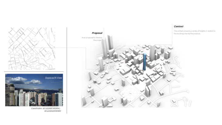 La Paz is the third most populous city in Bolivia. It perches at 3,650 m above sea level, making it the highest capital city in the world. Sopocachi is a bohemian neighbourhood in La Paz and a concrete jungle. We proposed a 30-storey mixed-used tower with terraces to introduce green space in the neighbourhood. Our design intention was to incorporate environmental analysis in our workflow to develop parametric design of the façade maximising the use of daylight and natural ventilation.