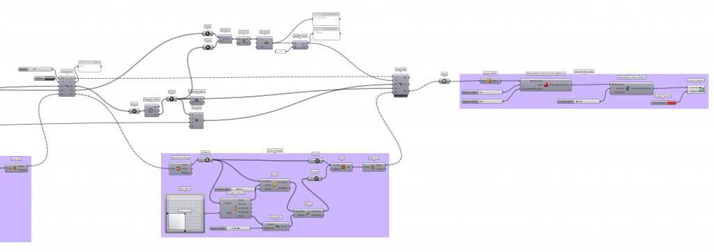 The process is to make a rectangular surface with the dimensions of the slab of the Barcelona Pavilion. Then to populate the surface using Populate 2D. Later the Voronoi Code is used to created a voronoi surface. This surface is later deconstructed into defined faces and edges from which center can be obtained. This center can be used to scale the defined surfaces down to make a new surface which can be moved on z-unit to create a loft. This loft is the input that the Anemone will use to create fractal loop. The grasshopper code below is the code used in the design.