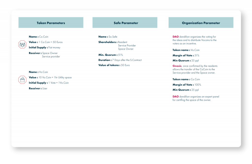 Cocoin is used as a payment asset that can be generated by exchanging fiat money. The residents are supposed to pay for the activities through the Cocoins. Once the idea is finalized, a smart contract is made between the space owner and the service provider for the short duration of the activity.
