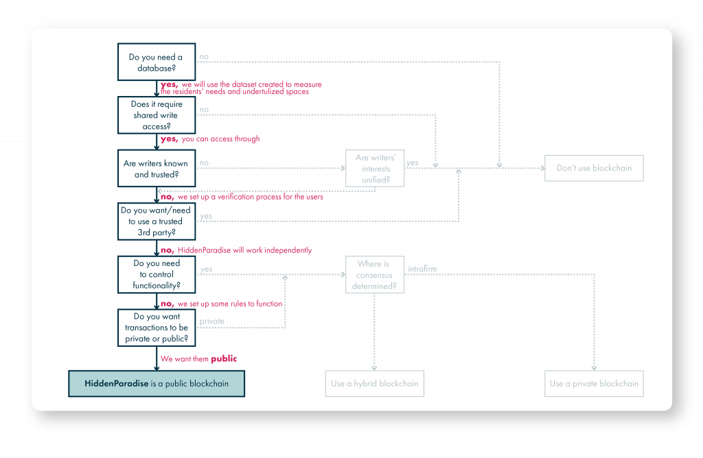 The main proposition behind using blockchain is for making local, transparent, participatory decisions and equal say for the usage of the underutilized patios. It would also help to deal with short-term smart contracts for space usage and to make transactions through the platform. Incentivizing participation through utility tokens it would also help to enhance the community and build new relations.