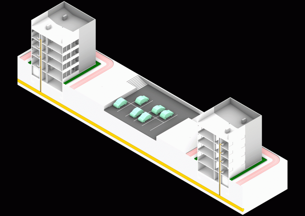 Unbuilt spaces that are a lot in 28 blocks were separated into 4 categories: private parks, public parks, unused spaces and parking lots. This project is focused more on unused spaces and parkings as parks are already designed and sometimes not accessible to intervene. The summarized area of interest is 120 000 m2. All these spaces were separated into those that are less than 1000m2 and more than 1000m2.