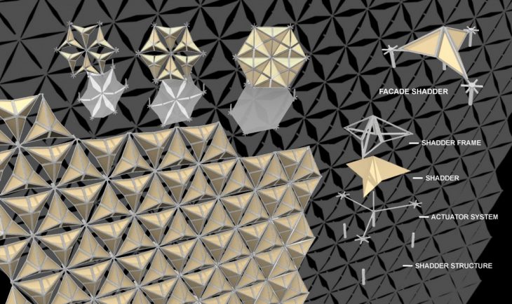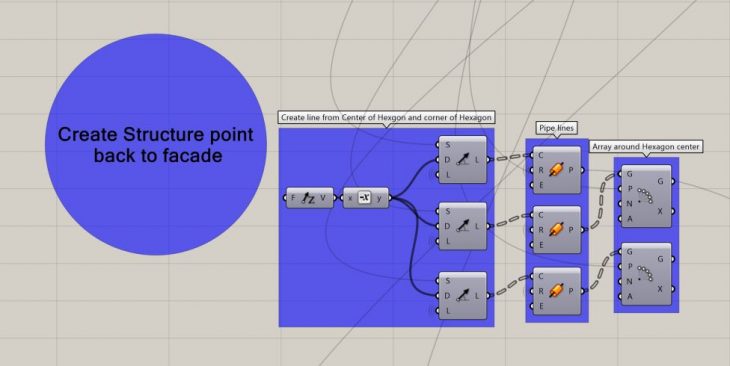 The computational process adopted for this parametric facade comprises of a transformation of the hexagonal facade to a triangular facade. The transformation is a reaction of the suns position in order to cool the building.