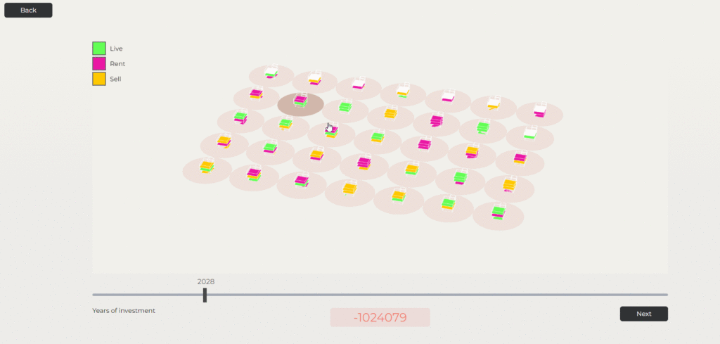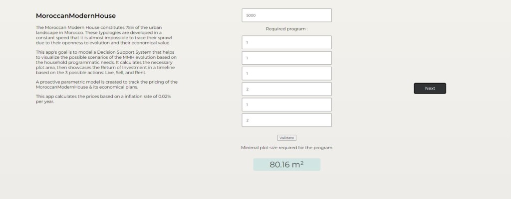 This app’s goal is to model a Decision Support System that helps to visualize the possible scenarios of the MMH economical evolution based on the household programmatic needs. It calculates the necessary plot area, then showcases the Return of Investment in a timeline based on the 3 possible actions: Live, Sell, and Rent.