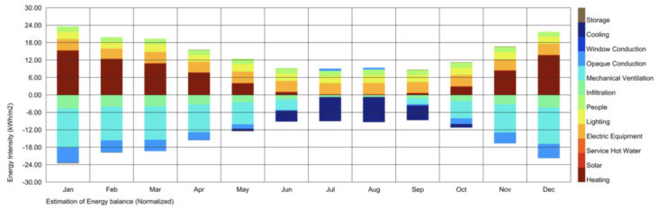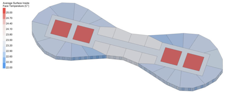 To test the effects of the proposed design on the energy balance of the building extension, an energy model was developed that approximates its performance. A hypothetical floorplan extends the existing cores of the building. A circulation area separates them from the rooms that are facing the facade. An educational program with classrooms, labs and offices was chosen. This allows the model to be representative of a wide array of public programs. The average surface inside face temperature remains optimal throughout all the frequented rooms over the entire floor. The impact of the many proposals to reduce solar intake are clearly visible, as the heating energy greatly surpasses the energy required for cooling, which is a great result for a building with a glass facade.