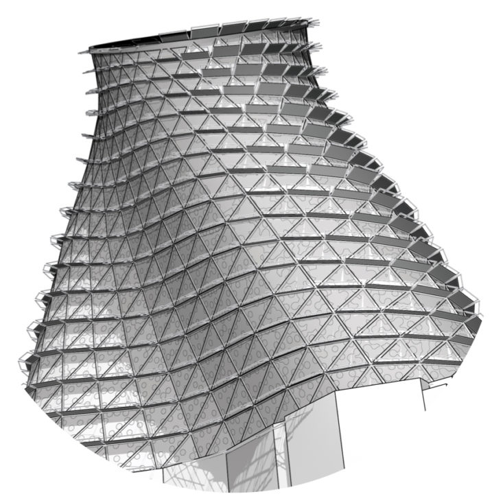 At first, the shape of the building base is inset and divided into a SubD with 10 subdivisions. A roof is created with the same topology to allow for a smooth loft afterwards. The roof is stretched to create a bigger surface for the solar panels. The surface is then rotated into the optimal angle and tilt for max. annual incident solar radiation, using an evolutionary solver. The two resulting SubD surfaces are then lofted to create a volume. The center of the loft is scaled outwards, to create a more aesthetic shape and to increase floorspace. With keeping topology in mind from the very beginning, the triangulated mesh that is taken from the SubD already has a desirable scale and is directly converted into glass panels.
