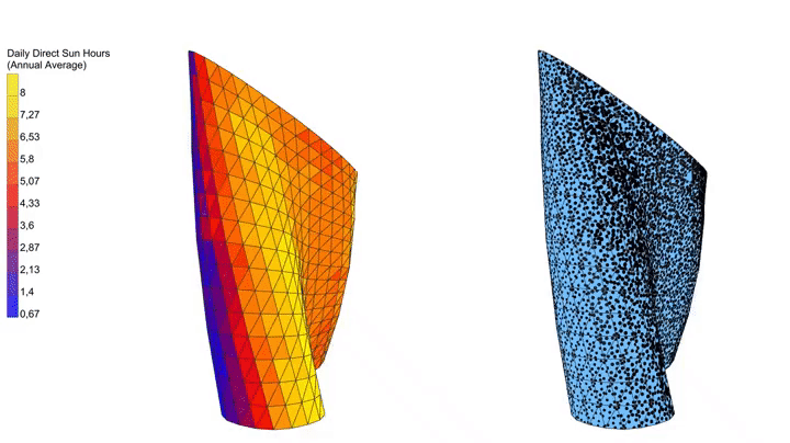 By sanding a glass panel until it loses its transparency, the amount of incident radiation that can enter the building through that panel is decreased. To use that effect for the energy balance of the building, the sanding is applied in a metaball pattern that increases in density in the areas of the facade that are get the most sunlight. The annual sun hour values per panel are remapped to create the translucent pattern. The south facing areas are most strongly affected by this change. The panels there have the highest amount of direct sun hours (yellow) and end up being almost completely covered by the pattern. Meanwhile the north facing part of the volume has a very low amount of direct sun hours (blue) and gets a homogenous, low density of the pattern.