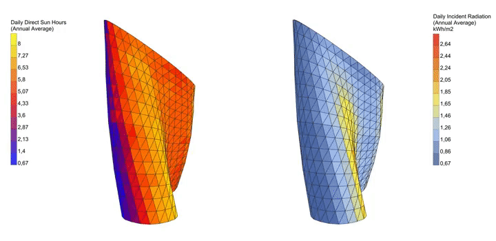 To further continue with the design process, sun hour and incident radiation analyses are conducted on the volume that resulted from the from finding process. Three sun paths are used to create an annual average: the summer and winter solstice and the spring equinox, representative of both equinoxes.