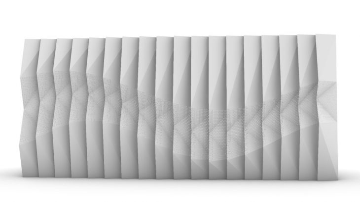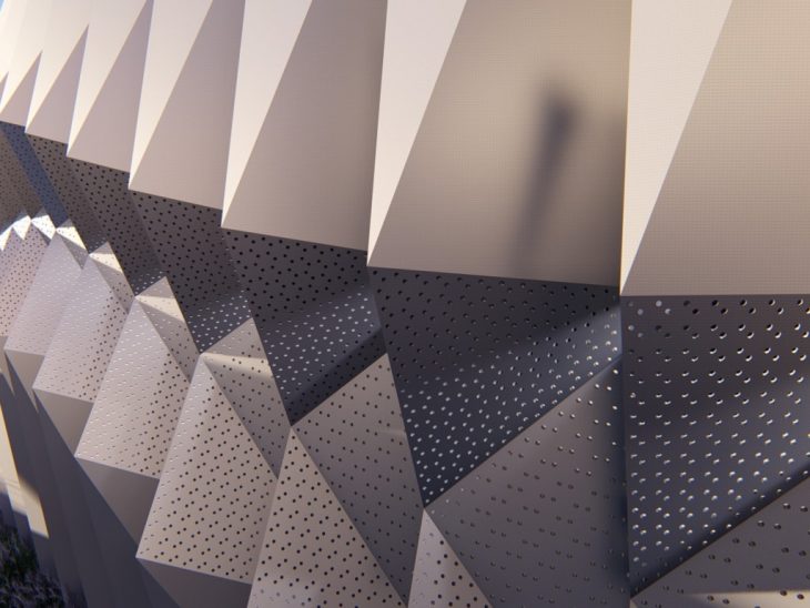 The design of the facade is focused on the objective of filtering and diluting direct sunlight aimed at the building. Some panels are composed of metal which are then perforated. The panels are also angled through gradual variation on degrees as a second method of light filtration. By decreasing the amount of solar heat gain within the interior space, the building is able to condition itself with heat reduction. The angles of the facade also allow for gaps in the outer shell which then provide natural ventilation into the interior spaces. With heat reduced and points of ventilation gained, the building is able to perform at an optimum as well as with minimal air conditioning units. The design itself works off of arrays and attractor point variations. A strip is composed using 3 points of attraction that will be manipulated in order to create the variation. Two points are lifted from the facade and edge lines of the panel then connect the points at varying lengths. The third point, the center point, is placed upon the facade and varies in distance on a singular plane. The two points are then connected to the center point. The panel is then arrayed and the points are slightly varied, this creates a more natural transition which in turn results to the facade’s wave.