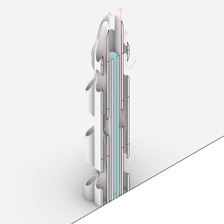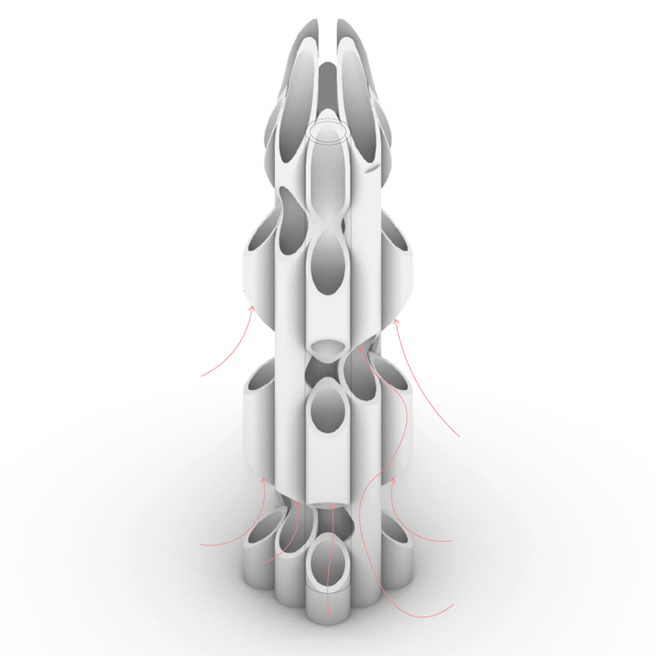 The assembled column-like structure is supposed to not be seen as pure ornamental object, rather an ancient alternative to modern air-conditioning. The centre tube can be filled with water and through the porosity of the clay the entire column will be a water cooled surface and by channeling the airflow through the openings and volumes of the structure it will have a cooling effect to its surrounding.