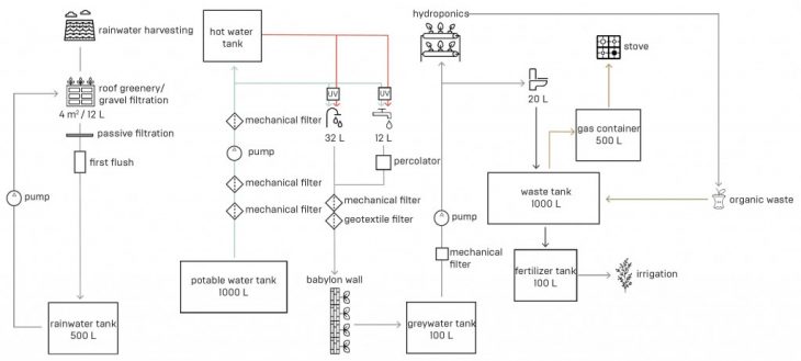 Given pixelation of roof, we decided on working with the roof team to redirect the rainfall into one of the roof boxes so that rainwater could be collected here and stored. As for the terrain and the house design on stilts, we created a metabolic core where the tanks and the majority of the system would operate. As the interior design also follows a metabolic core concept, we located the tanks following the function of the interior plan.