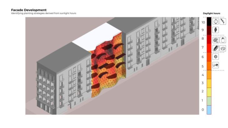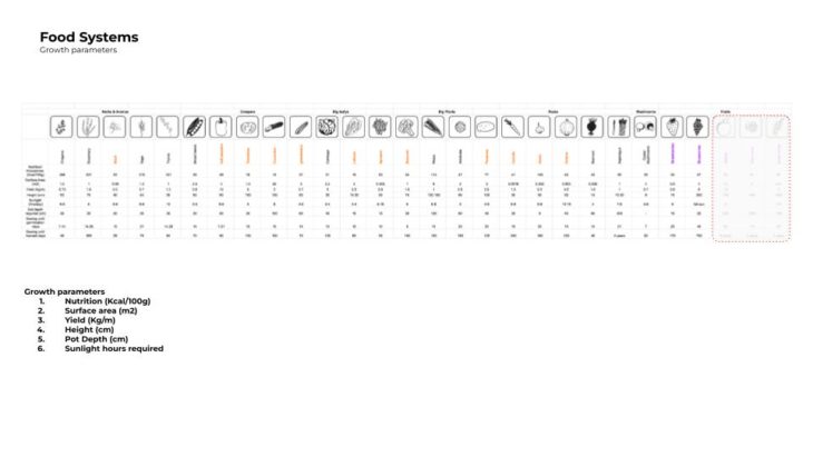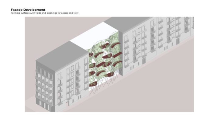 Looking at the food requirements of an average diet, there was a study made to find suitable crop types that can be grown on a façade supported by wood waste.