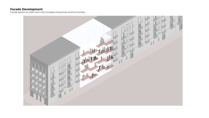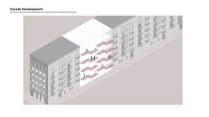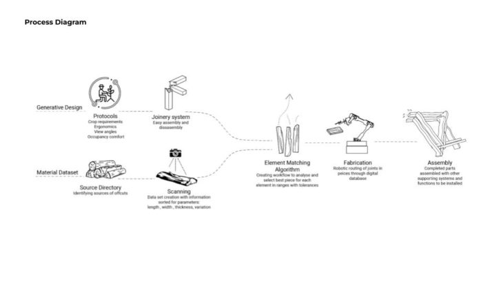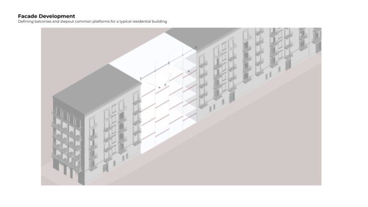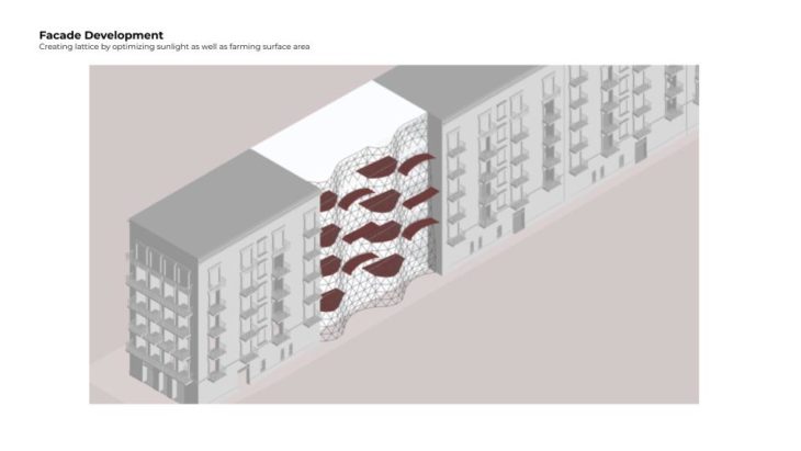 The aim of the proposal is to form a structural lattice from the waste pieces by an arrangement strategy from a generative algorithm and have as little need for fabrication as possible. This can be primary facade which allows fro platforms and balcony extensions as spaces for building inhabitants and also facilitates urban farming.