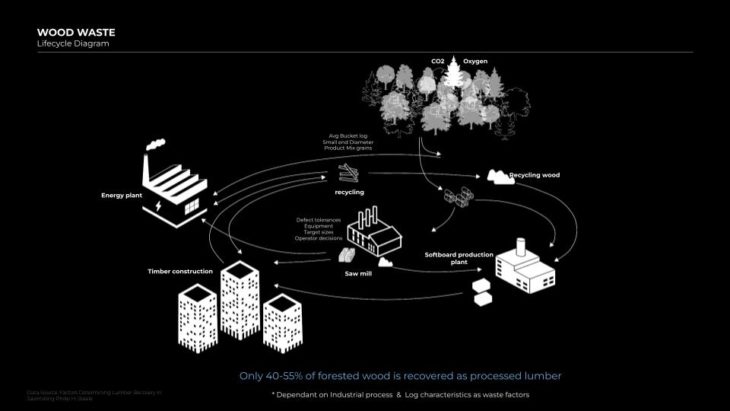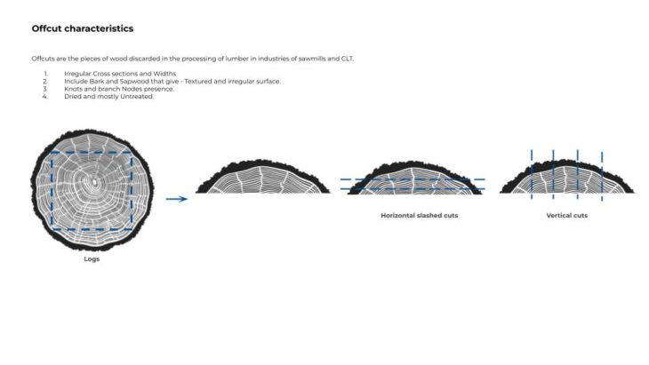 Only 40-50% of forested wood is recovered as processed lumber. Most of it is discarded as unusable pieces and converted into wood chips to be used or used as biomass. With the increase in proposals for mass timber architecture, the amount of wood waste will increase proportionally. Instead of Converting them into chips, we propose upcycling the discarded pieces by using them for a building skin that adds value to urban fabric by spacemaking.