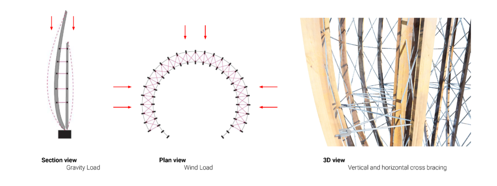 The bridge structure has a vault form and is generated from a 2D Voronoi pattern using a catenary form-finding method. The structure is only supported at the edges, where the vault meets the ground, which allows for the largest possible span of around 82m.