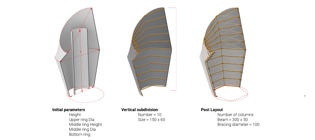 The placement of the bracing is done through genetic optimization. A Vertical post bracing of 3 and is subdivided into 10 divisions.