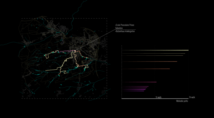 Walkable paths between Ecole Prescolaire Prince Sebastien and Butzenhaus Kindergarden and wetlands’ locations