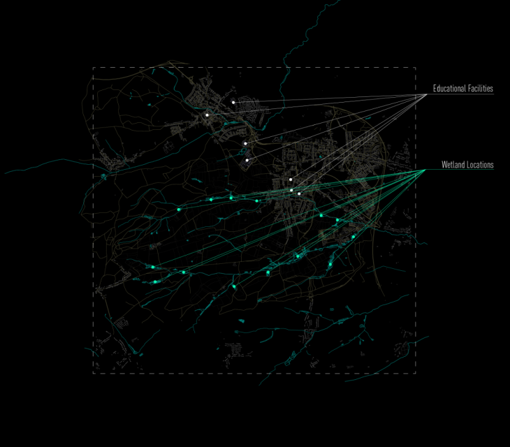 Walkable paths between every educational facility and each wetland locations | network: OpenStreetMaps Roads and Borders of Farmlands