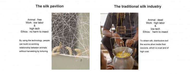 In the traditional silk industry, silk essentially comes from silkworm spit. Once their cocoons are finished, silk is harvested for human consumption by killing the insect with steam, hot air or boiling. Cocoons are placed in hot water to loosen and extract the silk fibers. It takes about 2,500 silkworms to make one pound of silk , which is of high labor but low tech. And also research have shown that this method will cause silkworms to die in an extremely painful way. While in silk pavilion project, it explores the relationship between digital and biological fabrication on product and architectural scales. They use light to effect the variations in movement of the silkworms, which do not harm to insects.