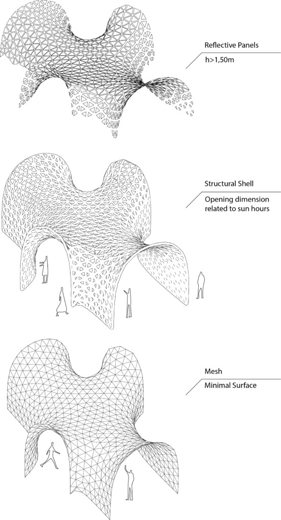 As a final element, reflective planar panels are added into the structure in each aperture above 1.5m to block the direct sunlight coming from above and thus leaving only the lower apertures of the structure fully open.