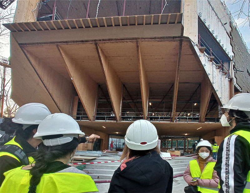 During the tour inside the building, the students were able to see up close how the different wooden sections of the building had been assembled. This experience allowed them to understand the way in which these types of structures are organized and materialized, which in turn will be useful for the development of the students’ future projects. Among the questions and conversations on this topic, Elena Orte explained the process through which the wood must pass to remain exposed, how some construction details were defined and the fire systems, among other aspects.