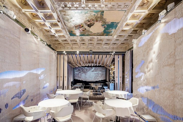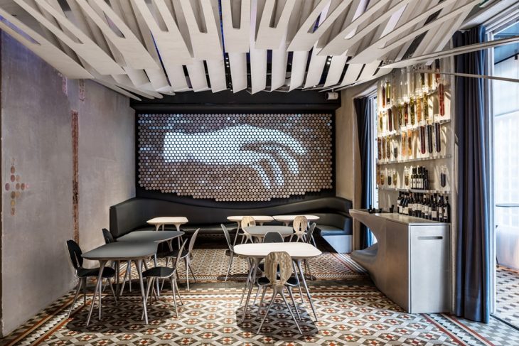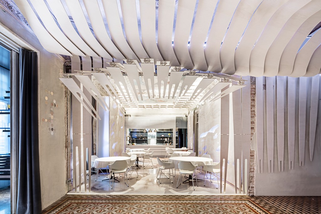 The restaurant is located in the city center of Barcelona, on the main floor of a modernist building left unoccupied for 40 years. The project design has been carried out taking into consideration two elements: the pre-existing architectural context and the specific gastronomic offer of the Michelin-starred restaurant Alkimia, which is 80% based on fish.