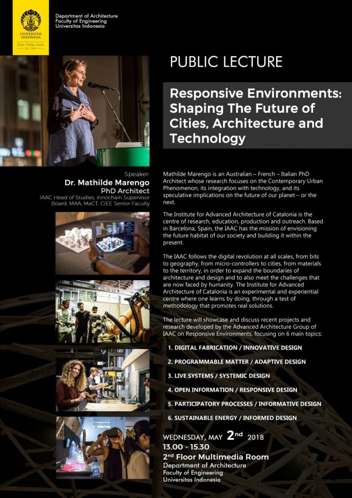 We’re glad to announce that on May 2nd, IAAC Head of Studies Mathilde Marengo will be lecturing about “Responsive Environments, shaping the future of cities, architecture and technology” at the Faculty of Engineering of the Universitas Indonesia.