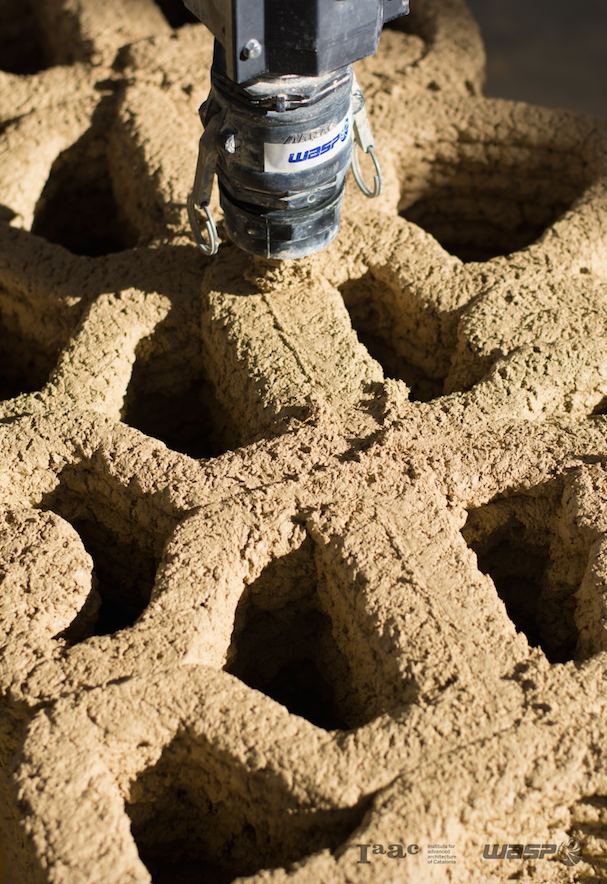 The printing process took 40 hours, with an overall material amount of 2 cubic meters, by modelling internally multiple surfaces able to confer both solidity and aesthetic expressivity. This work can be considered a first significant step towards the realization of load-bearing earthen structures.
