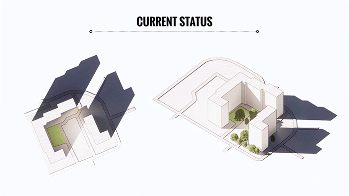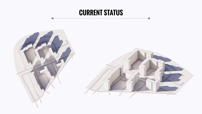 On the block scale we repurpose the former parking lots as grounds for the public interventions and the economy pods and create a buffer zone of greenery that would line the buildings and prevent any strong cold winds from entering the courtyards. Then provide pathways that connect the different.