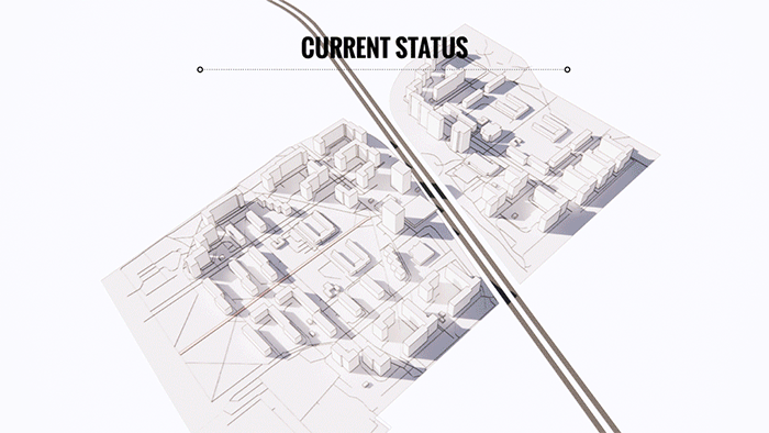 The interventions are split over three scales of actions which are envisioned to occur over a span of 10 years. Beginning at the community scale (1 minute walk), smaller interventions begin early on such as the installation of the flexible pods which begin to activate the community and create a local economy. Scaling up to large infrastructure intervention in the mid term such as mobility changes and building of an elevated green link and new residential buildings.