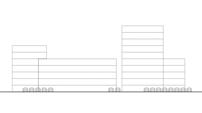 In the long term, bigger interventions are planned such as the green bridge connecting the two parts of the district currently separated by a large motorway. And finally, new residential buildings are added to redensify the area and make up for the parts previously removed from existing residential space to allow for community space.