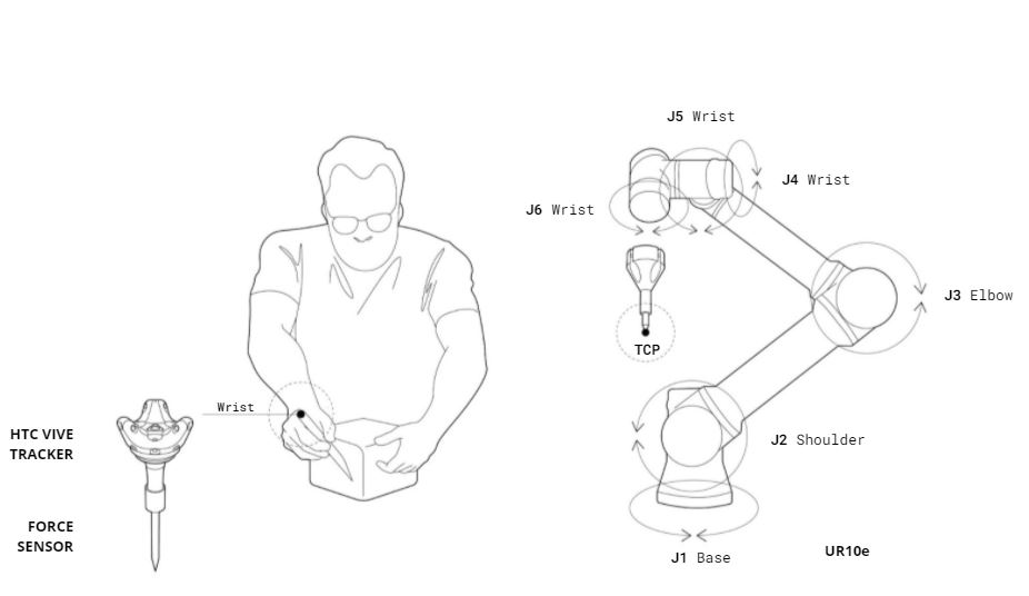 We used HTC vive tracker to transfer the human hand motion from human workspace to robot workspace.