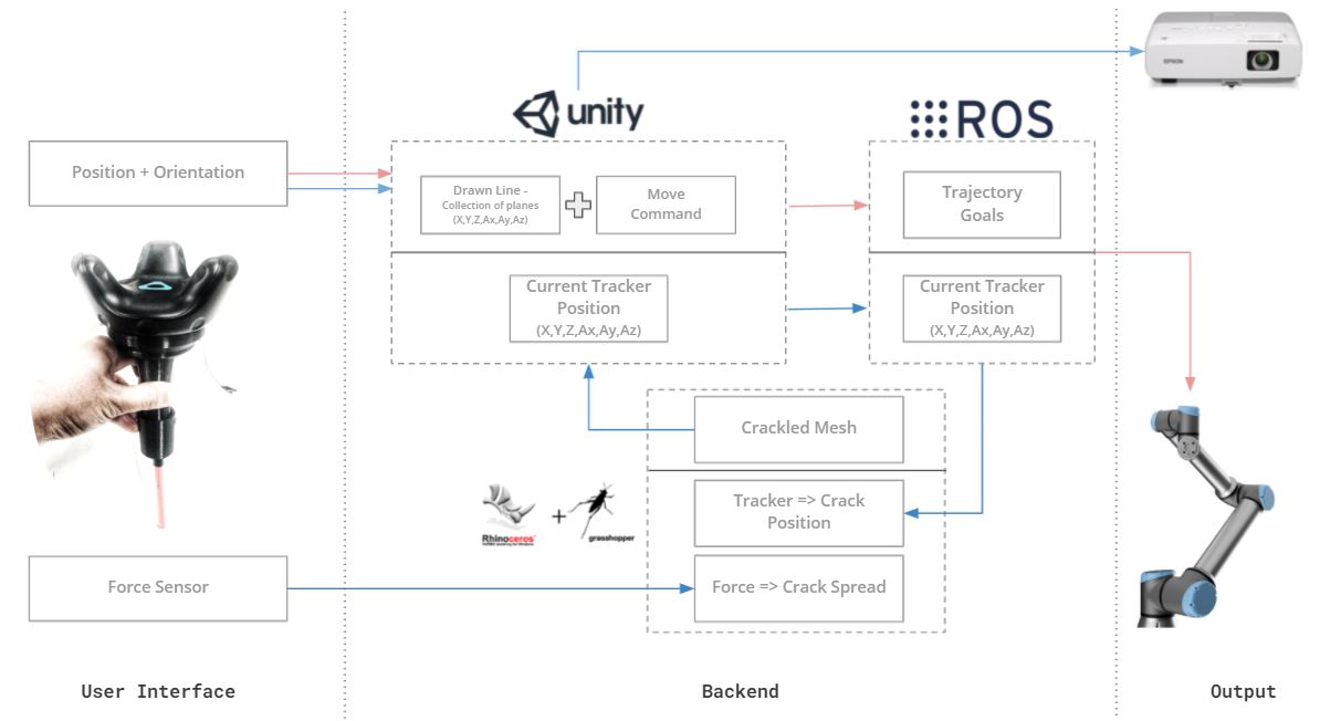 - Visuals – As the artist presses the tool to draw different strokes and curves in his drawing. The force sensor will read the force data. Force data is then used in grasshopper to generate a glass crackling effect. The effect generate is transferred in Unity using Grasshopper-Unity plugin.