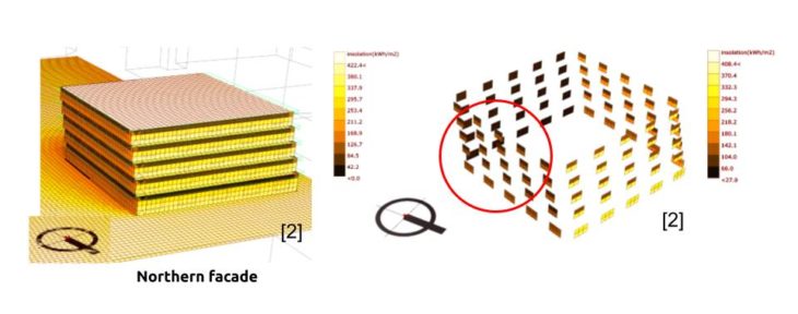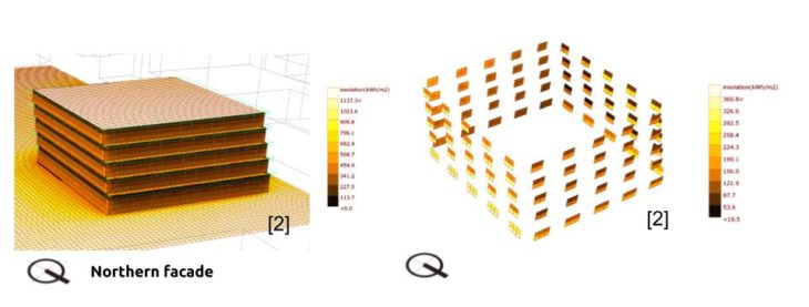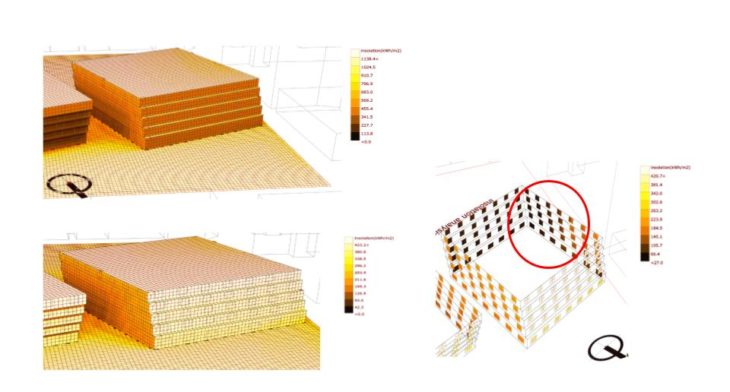 One of the main problems – relatively low irradiation at the western facade of the building – was slightly improved in this iteration, while irradiation at the opposite side worsened.