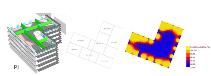 The top floor of the building was analyzed, with the Y axis is aligned to the north.The lack of daylight, which appears to be caused by the excessive width of the floor, is found mainly in the central area of the top floor. The distance between the windows was also found to be related a lack of daylight.