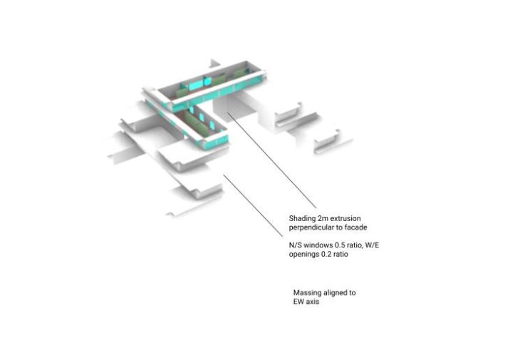 We also tested a stacking boxes approach to address the daylighting issues in previous massing iterations, adding 2m shading extrusions and aligned the massing to the east-west axis.