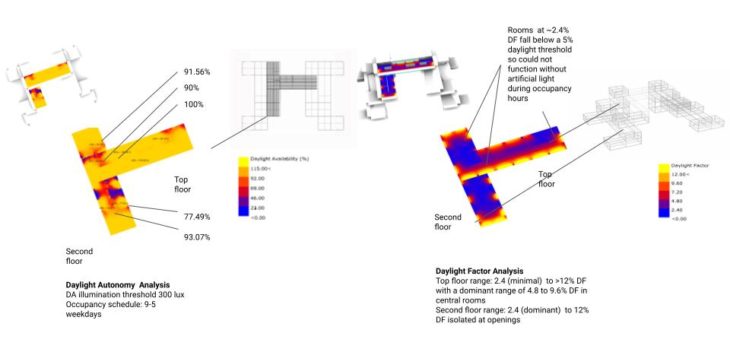 We observe that there is high daylight availability across the entire top floor of the structure within a range from 90 to 100%. Only one room on the second floor suffers from excessive shading resulting from the overhang of the top floor, with values in the shadow zone of this floor falling to ~23%. The remainder of the second floor receives a high degree of natural sunlight ranging from 77.49 to 93.07%. From this we can see that the illumination threshold is met and/or exceeded for the majority of the rooms on the second floor and all rooms on the top floor, suggesting that artificial lighting may not be necessary during occupancy hours. Future iterations are still required in order to avoid illuminance exceeding the threshold.